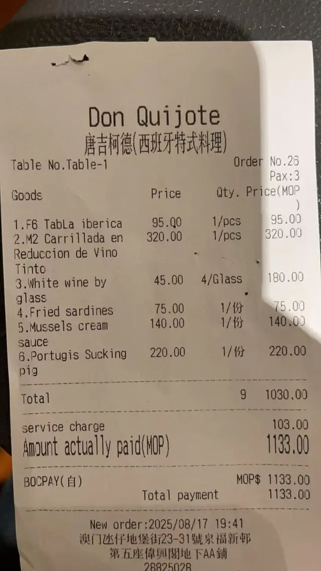 結合異國風情 — 🇪🇸🇵🇹西班牙crossover葡國菜 ANASLevel 42025-08-31270 views Follow 在澳門想食得有特色啲?✨唐吉柯德✨是我們心水之選!現是唯一一間同時提供正宗雙國,西班牙與葡葡牙菜的餐廳!環境舒服,帶異國風情,推介三道菜:炸沙丁魚用上新鮮嘅小沙丁魚,簡單地用海鹽調味,再炸到外皮酥脆,但繼續保持鮮嫩多汁,感覺有點像在吃零食一樣,送酒一流!葡式烤乳豬呢度菜絕對係葡萄牙嘅經典之一!精髓在烤製技巧,原來加左葡式啤酒🍻乳豬外皮烤到金黃酥脆,內裡的肉質濕潤多汁,輕鬆就能切開,搭配簡單的烤薯菜和醬料已經夠好味!1紅酒燉豬肉燉製時加入大量紅酒、洋蔥、胡蘿蔔、蒜頭和香草,豬肉吸收左紅酒的果香和醇厚,好有層次感!而且豬肉燉完後非常軟嫩、入口即化!The above review is the personal opinion of a user which does not represent OpenRice's point of view.LikeShare結合異國風情 — 🇪🇸🇵🇹西班牙crossover葡國菜 唐吉柯德 https://s.openrice.com/QrKT1Y2rU00Report Post Ratings4Taste4Decor4Service4Hygiene5ValueDining MethodDine In