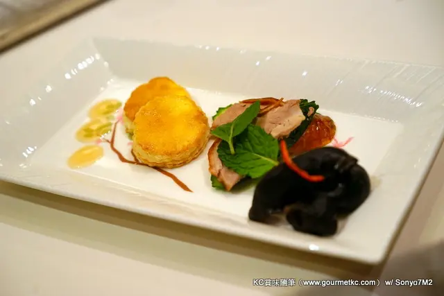 六道菜的午餐,配上的就是五款不同的香檳。悅口小吃就是香麻紅蜇頭,爽脆而帶點酸甜的味道也令人胃口大開。前菜先來的是燒鴨脯,佐以兩片脆口的酥餅再加一點酸梅醬,無論在味道及口感上都很出色。
