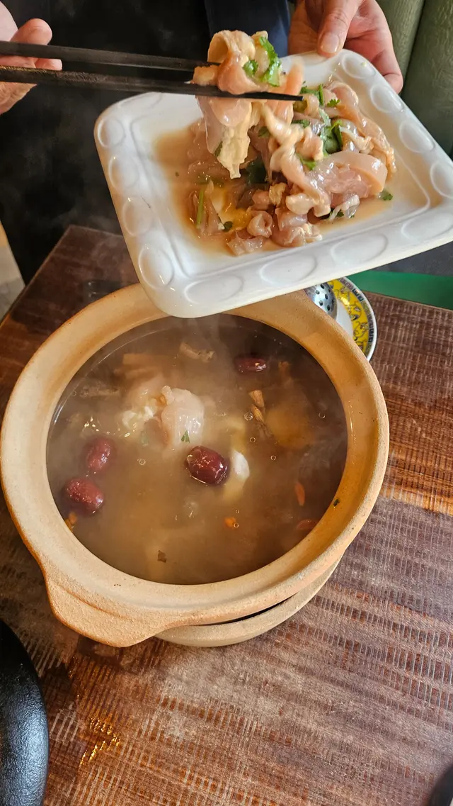 行入餐廳,瞬間被濃厚的中式韻味包裹。鏤空花窗,牆上山水畫意境悠遠,與雕花古燈的柔和光暈相映成趣。最別致的是,餐廳中竟矗立著一座雅緻涼亭,可於亭內用餐。此情此景,彷彿置身於古典園林,在古香古色的氛圍中,令用餐也成了一種風雅體驗!🏮 古法藥膳土雞煲店員即場將新鮮的土雞肉放入砂鍋中與紅棗,黨參,龍眼等一起煲,真是暖心暖胃的極品!藥材與雞肉的馥郁香氣撲鼻而來。土雞肉燉得軟嫩至極,湯入口溫潤甘醇,從胃裡暖到心裡,是滋補養生的絕佳首選!🍤 荔枝蝦球好靚的一盆盆景端上台來,一顆顆飽滿的荔枝垂吊在枝丫上,令人十分驚喜,打卡一流!入口是酥脆的外皮包裹著彈牙鮮甜的蝦肉,帶來意想不到的驚喜口感!🌶️ 辣子田雞田雞肉外酥裡嫩,肉質緊實Q彈,經過爆炒後香辣入味,花椒的麻與辣椒的辣在口中交織,麻辣鮮香,風味十足!🔥 蔥爆牛肉牛肉片切得厚薄適中,大火快炒鎖住了肉汁,口感滑嫩無比,十足的「鑊氣」,鹹香醬汁均勻地裹在每一片牛肉上,搭配爆香得焦脆的大蔥,香氣逼人,讓人忍不住一口接一口,瞬間盤底朝天!🍹 雜果賓治色彩繽紛的水果與汽水結合,清爽解膩!…Read More