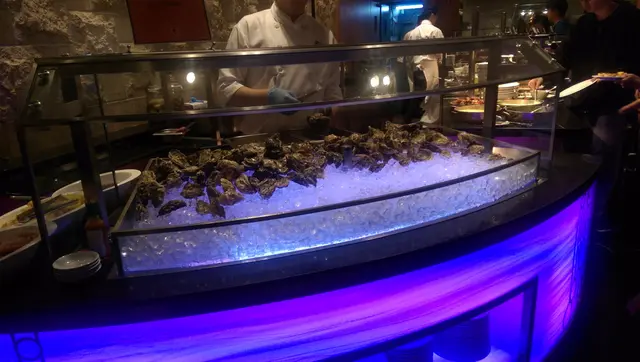 有吞拿魚、三文魚、八瓜魚、甜蝦、北寄貝等等。入座時給你我們各人一張換領卷,到自助櫃位拿一客鵝肝牛柳,廚師即煮的關係所以鵝肝外脆內嫰,牛柳多汁不會太老!我主攻海鮮,不太熱衷熱盤菜式,但也吃了一碟,有焗蠔、茄汁煮青口。最鐘意即燒的串燒,有牛肉有雞肉,有幾款醬汁可以夾住食,款式算是多了。海鮮才是我的主菜,甜品只是淺嘗,款式多款,最特別是有即製窩夫。…Read More