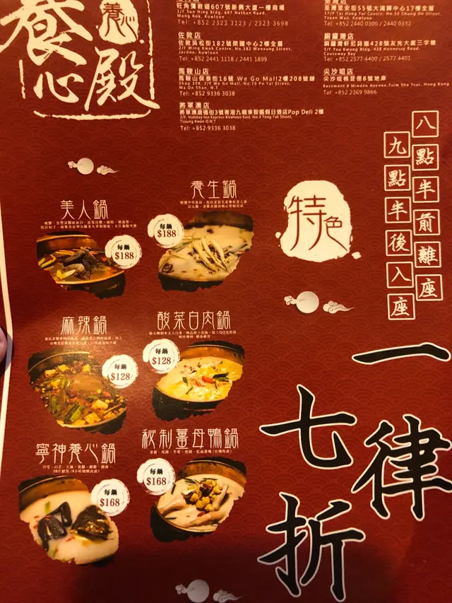 本人同女朋友都好鐘意打邊爐,今次就搵左位於尖沙嘴嘅養心殿。一入到去覺得環境好特別,好有古代feel,另客人享有一個私人空間。試左佢個寧神養心鍋 用料豐富 味道幾濃郁 唔錯 之個叫左啲牛肉 豬肉 配菜等等 都食得出平時任食火鍋嘅好 不過一分錢 一分貨 價錢當然有返咁上下 想黎返個有質素嘅火鍋餐都可以黎一試…Read More
