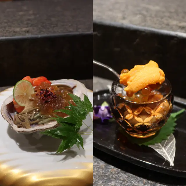 尖沙咀嘅餐廳選擇真係好多,呢間係朋友推介嘅Omakase🍣菜式幾有gimmick,好味又好睇👍👍晚市有三個套餐揀,我哋揀咗Omakase Moon🌕好豐富🙈🙈先上一款前菜,係鮑魚車海老🦐佢上面有一個鮑汁啫喱,好特別,而且好refreshing。然後會有五款刺身🐟‣第一道刺身已經好吸引,泡泡入面係伊左目同甜蝦 , 兩樣包住一齊食,再加上酸汁~‣三文魚籽海膽 佢嘅魚籽係自己醃製 好爽口,入口有爆開嘅感覺,亦都好甜‣北海道象拔蚌 冇太多調味,主要品嚐佢嘅鮮味~唔錯呀!‣北海道毛蟹 佢亦係配咗海膽,啖啖肉之餘加埋海膽又爽creamy😝‣獅魚 佢係大條既油甘魚,輕輕火炙過後更加肥美~而我都幾欣賞呢度嘅過場料理,燒穴子冬瓜煮~兩樣都煮到好嫩好入味!都算係我最鍾意嘅一道菜之一呢個set有10件壽司,前五件都係常見嘅魚類,真鯛、帆立貝、深海池魚、地金目鯛。整體都係簡單調味,食得出佢嘅鮮甜,當中地金目鯛幾出色,夠肥美~石垣貝都好新鮮!你睇吓佢縮得幾多!然後有較濃味嘅銀鱈魚、赤身、喜之次同中拖羅,感覺呢幾款魚更加出色,赤身同中拖羅係來自同一條魚,肉質好滑,味濃但無任何一點點腥味。但我都係更喜歡佢嘅喜之次!海膽壽司份量都好多,今晚食咗好多海膽好滿足🙈🙈師傅仲會撒上金箔同淡雪鹽~靚之餘我都好鍾意淡雪鹽同海膽呢個配搭‣ Omakase Moon $1580.[#fatpet_japanese] …Read More