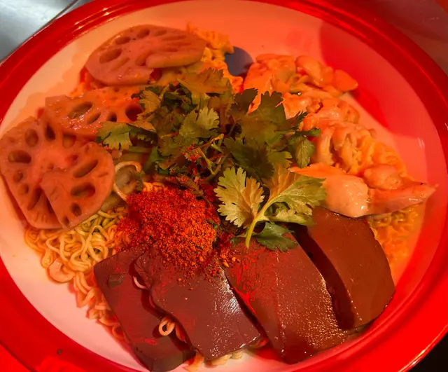 我朋友另外點咗一盆盤盤麻辣燙,佢加咗蓮藕,鴨血同雞柳,而麵底揀咗公仔麵。麻辣燙係小辣而唔會太辣,係麻辣味道好濃厚。我試左幾啖,覺得佢加咗嘅配料都好新鮮,特別係嘅鴨血,好彈牙,一啖落去好多汁