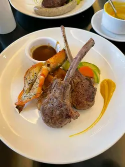 坐低之後我地就分別叫了美國頂級牛肩扒拼紐倫堡腸 & 羊架拼大蝦配薯菜。賣相睇落幾好,點知...好神奇,微暖的扒我真係第一次食