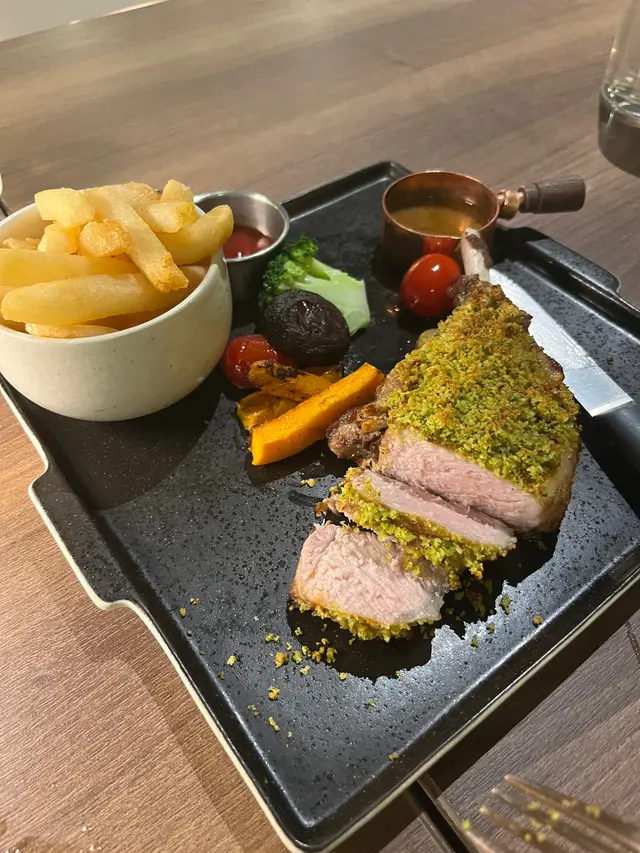 同姨甥女慶祝生日經朋友介紹去咗荔枝角間樓上餐廳慶祝生日呢間店舖交通方便地鐵站行返來只需3分鐘就到位於工廈我相信主力做熟客廣傳口碑!上到去完全是另一個感覺地方寬敞時尚加上侍應殷勤的款待好舒服的感覺 !於是我哋落單選擇香蒜花甲意粉、焗開心果西班牙漿果豬鞍架、飲品就House wine及紅柚果茶花;最先來是意粉好香蒜蓉味之外又帶有蜆肉的鮮味,而且又唔會太乾身意粉汁好鮮甜,令每條意粉掛上海鮮的鮮味再夾雜着火箭葉令味道再提升真係做得相當出色我好欣賞👍豬鞍架看似乾身其實唔乾還滲出果味因為鋪滿了開心果再蘸上配汁十分滋味當中伴料薯條非常鬆脆,食物質素相當高睇得出廚師用心的製作👍由於意猶未盡再order甜品焦糖燉蛋和Tiramisu好味甜在心頭好嘅食品當然要同朋友分享我會多啲同朋友過來再試其他款式…Read More