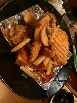 豬手細份其實都好多,四人食都有剩。好食!煙un 得黎都淋既。有生菜,包醬,蒜片,辣椒片包住食。魚糕湯食左啲先影相,湯頭順口,飲完唔頸渴,魚糕都好多,仲有啲韓國粉絲喺入面。Out 晒focus Tim,海鮮煎餅煎得香脆,足料。半半炸雞,啖啖肉,甜辣醬同埋蜜糖蒜香都好食,食完要舔手指🥰薯格有啲唔同味既粉喺上面,螺旋形薯片超正,外脆內粉嫩!嘢食全部都好味,下次會再嚟…Read More