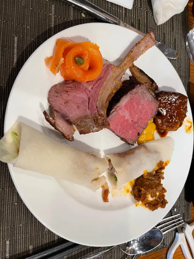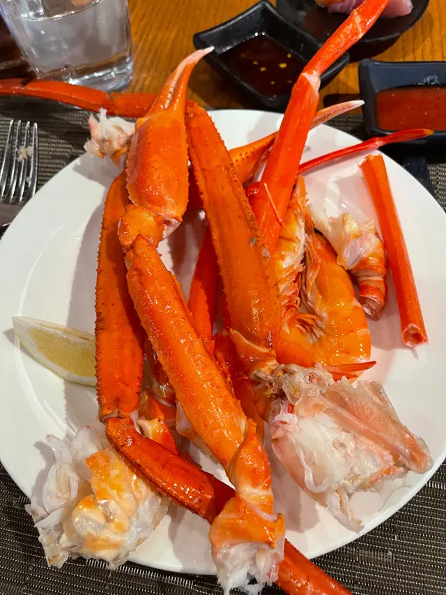 係紅磡地鐵站行過去約10分鐘左右。一來到門口有陣陣榴槤飄香。已經好期待。哩間自助餐想試左好耐。價錢有小小貴。但吾食過又吾心熄。好彩今次午餐無失望。開頭蟹腳好多人排隊。甘轉食沙律前菜先。有煙三文魚,Pam’s hum岩晒我。仲有勁多款底。味道都好食。蟹腳都好大隻同新鮮。鮮甜。牛扒熟左小小,牛扒🥩軟牛味重。羊架味道吾錯。不太蘇。刺身魚生款式就小左do.和牛壽司入口即溶。食物太多款。試吾晒。要去多次先得