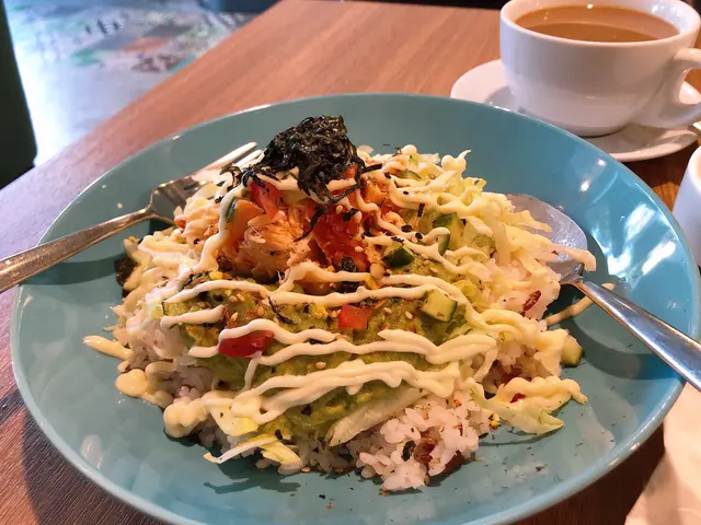 港島南區黃竹坑曾經係工業集中地,近年有少量商業大廈,西式餐廳亦多咗選擇。B&B 樓底好高,面積又大,環境衛生舒適,主打日式西餐。沖繩特式三文魚牛油果🥑塔可飯 $118「塔可飯」其中一個特色係份量大到令人不知如何是好😂,呢到個飯底係用日本珍珠米加入少量糙米,但煮得唔夠香軟,仲有啲過濕。飯上放滿牛油果醬、生菜、三文魚、番茄、青瓜等材料,混埋沙律醬一齊食,係單純卻容易上癮的滋味。跟餐仲有湯或沙律🥗供應,加$10就多杯飲品。港式咖啡味道酸澀,要加入奶先飲到。…Read More