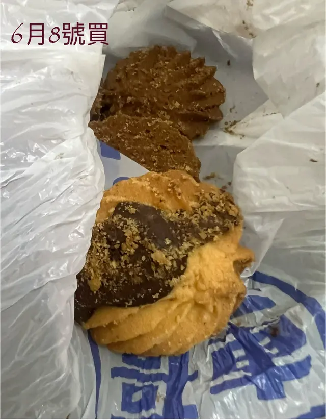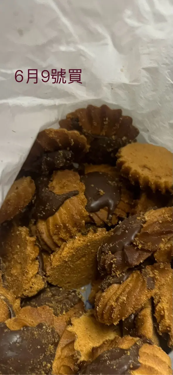 咁食過返尋味,就係6月9號由將軍澳出發去太子買左$100朱古力味曲奇,返到屋企食第一塊嘅時候就發現咗唔同味,在望清楚啲發現同前一日買個啲曲奇啲顏色好唔同,原來係燶咗~