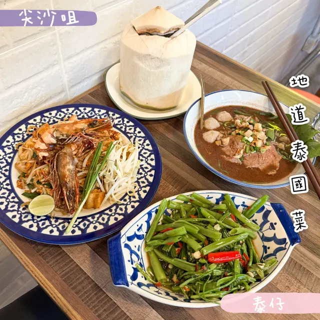呢間餐廳係由泰國人主理播住唔同泰文歌 幾有氣氛 🎶 食物質素都唔錯 幾有泰國風味🇹🇭 ✨泰式虎蝦炒金邊粉(💰$118)虎蝦好大隻 有兩隻 幾彈牙🦐金邊粉炒得乾爽唔油膩👍🏻撈埋啲辣粉 辣辣地 幾惹味🌶️再加埋花生 芽菜同青檸汁 正🤤✨泰式船麵和牛金邊粉(💰$118)湯底好香 夠濃郁 唔會好鹹金邊粉幼身 好掛湯 吸晒湯嘅精華加埋幾嫩滑嘅和牛同彈牙牛丸 滿足😋✨泰式燒豬頸肉(💰$88)豬頸肉燒得幾juicy 唔會好乾身肉質夠嫩 爽口彈牙 邊位帶焦香😋有醬汁沾嚟食 但就咁食已好夠味😆✨泰式飛天炒通菜(💰$58)通菜炒得爽脆 加埋啲辣椒同蒜頭食落惹味 唔食得辣嘅可能要叫小辣✨椰子雪糕配吐司 鴛鴦醬(💰$68)吐司搽咗牛油 上枱前已切開幾件👍🏻再倒上鴛鴦醬(奶茶醬同斑斕醬) 兩款醬都充滿泰式風味 各有特色面頭再放咗一大球椰子雪糕 🍨 仲撒上椰絲同花生碎 食落好豐富😆✨椰青(💰$58)椰青夠凍 飲落清甜 啱晒夏天飲✨青綠梳打 (💰$28)…Read More