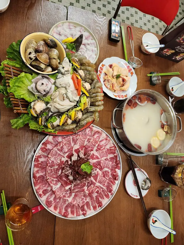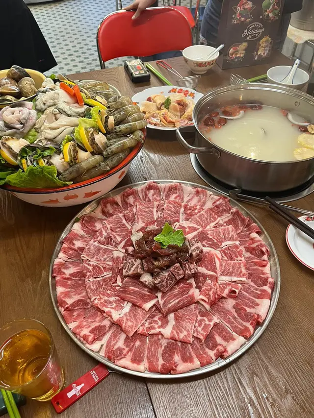 最近朋友生日 行過尖沙咀慶坊見到一間懷舊風格嘅火鍋店於是就聯絡老闆訂枱試一試原來佢哋有得訂海鮮拼盤 兩日前預訂 係新鮮海鮮直送6個人試咗點左個椰子雞湯試椰子雞湯好清甜 濃而不淡 飲左幾碗湯先開始打邊爐點咗個牛肉拼盤 超級巨型 啱晒多人一齊食!抵食!