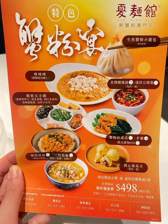 想食正宗嘅上海菜,我會選擇夏麵館,趁住最近蟹季,餐廳推出全新套餐「特色蟹粉宴」,超級豐富!哆唻咪 呢道咁特別嘅餸菜其實即係鮮蟹粉河蝦仁,用一両既蟹黃,加上二両既蟹粉,放喺三両嘅河蝦上邊,蟹嘅味道超級濃郁,非常順口!生煎蟹粉小籠包小籠包用鐵板呈上,每粒小籠包都包住蟹粉同鮮豬肉,淡淡嘅蟹黃味一路滲出嚟,仲有唔少肉汁添。皇牌酸辣湯酸辣湯果然係王牌,辣同酸嘅平衡做得啱啱好,而且好足料,越飲越開胃。精裝五小碟一次過可以試晒五款唔同嘅前菜,包括有蒜香四季豆、虎皮素鵝、鎮江水晶肉、美味海蜇頭、涼拌小木耳,各有特色,非常滿足。蟹粉扒芥蘭可以選擇菜心或者芥蘭,菜同蟹粉嘅份量都好多,每一條菜都可以沾滿蟹粉,夠晒惹味!三蝦煨麵 呢款主食係最推介,首先係濃郁嘅湯底本身已經夠晒鮮味,再加上蝦籽、蝦腦、河蝦仁,令到湯底好鮮甜,同上海麵係一個非常適合嘅配搭。開心果高力最近開心果嘅嘢食都好Hit,估唔到可以整成開心果高力,軟綿綿嘅外皮包煮濃郁嘅開心果醬,夠晒特別!豆漿有好濃郁嘅豆味,甜度適中!…Read More