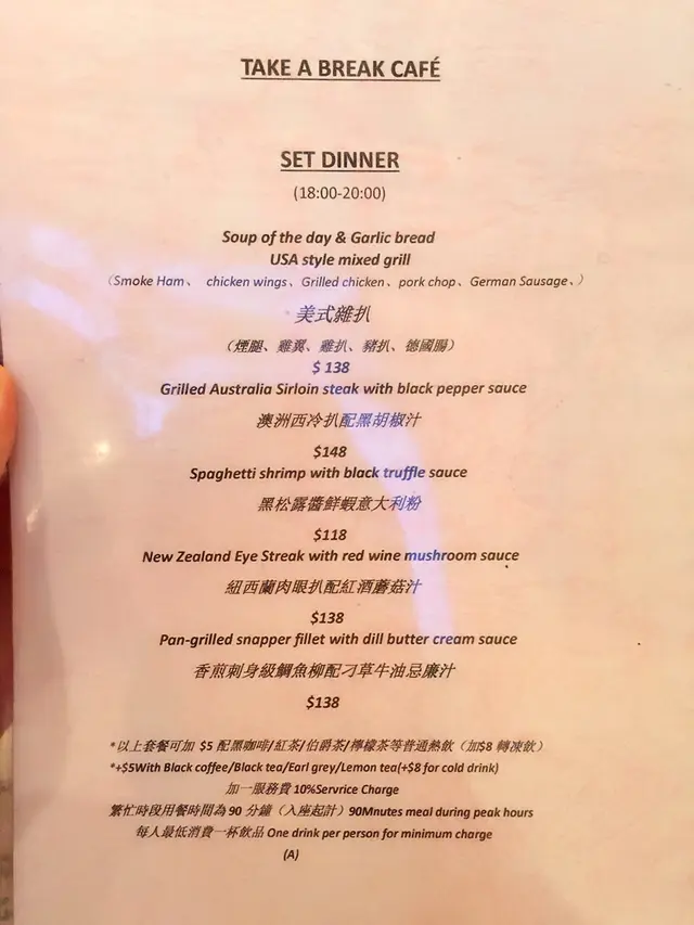 去土瓜灣探個舊朋友,朋友亦盡地主之誼帶我去附近晚膳。呢間餐廳從外觀到內裡既裝修都非常讚,燈光柔和,氣氛唔錯,估計呢到食野唔平果然冇估錯,平均一份set dinner都要$100起,估唔到係土瓜灣既cafe食野都咁貴。難得今日開心,就叫個美式雜扒餐enjoy下套餐包蒜蓉餐包及是日餐湯,是日餐湯係粟米忌廉湯,飲落好香粟米既鮮甜味,加埋忌廉滑滑既口感,好正!! 等左陣主菜黎啦,主要有雞扒、豬扒、雞翼、德國腸、煙腿,再加埋薯角做配菜,感覺份量好多。醬汁一般,最欣賞塊雞扒表皮煎香,食落香脆而肉質依然嫩滑多汁,整體樣樣都好味,唔會難食,但唔太特別,相對呢個價錢就唔值啦………Read More