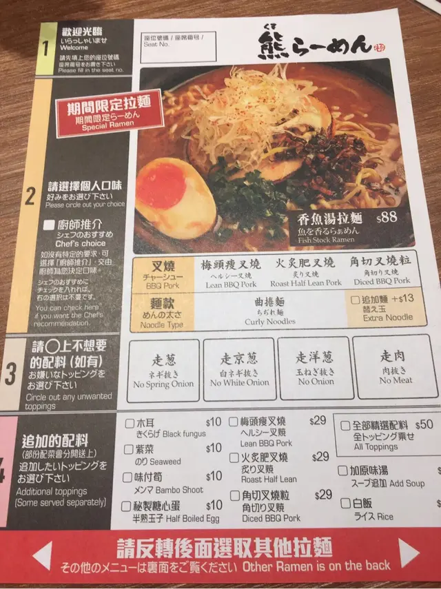 坐bar枱位可以望住師傅煮麵、熬湯、調味、上盤,令等待時間好快就過,而且可以欣賞吓師傅嘅技術。先睇睇餐牌,有成六張咁多,有介紹店內提供嘅三款叉燒同埋兩款麵(博多1.25mm細麵、熊本1.5mm中幼麵)嘅分別,有啲資訊性嘅內容,係呢度食拉麵之餘仲可以學到一啲拉麵知識,感覺呢間拉麵店好重視拉麵文化,更想客人可以了解、認識拉麵,好有心思。魚介熊拉麵($88) 我選擇咗梅頭瘦叉燒、中幼麵、軟身。第一啖試咗個湯先,好濃郁嘅魚介湯配合香油味道濃厚,我飲到停唔到口。叉燒瘦得嚟唔會鞋,厚度適中,而且加咗少少蘿蔔蓉,令叉燒味道增添酸甜感。而中幼麵嘅掛湯力並不比幼麵遜色,同樣做到好濃湯味嘅感覺,而軟嘅麵質符合我喜好,唔會太腍。超級黑熊拉麵($125) 朋友選擇咗火炙半肥瘦叉燒、幼麵、硬身。佢就話個湯好香黑蒜油味、香氣十足,另外而佢個碗由於係”超級”黑熊拉麵,所以份量應該係加倍,非常飽肚。…Read More