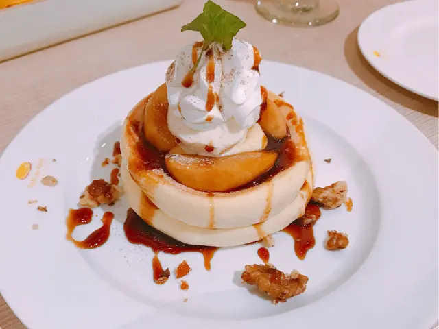 好彩冇人排隊即刻入座。叫咗一個焦糖蘋果pancake。一杯mocha同matcha。當日已經食到好飽先嚟,甜品係呢款空氣pancake,所以完全冇負擔。