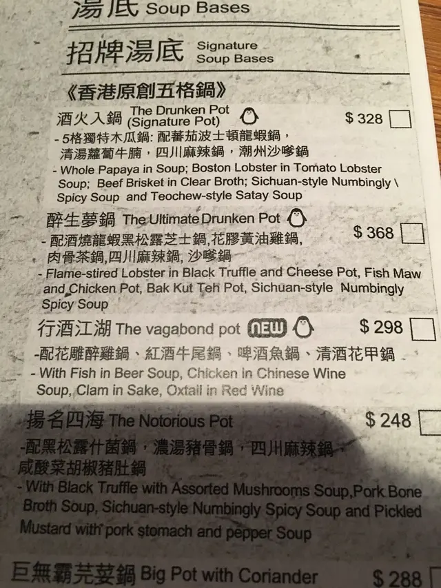 火鍋友提議去銅鑼灣酒鍋打邊爐,原因係有多款湯底選擇,去到先知原來一個鍋可以有五款湯底!絕到適合我地d選擇困難嘅人。店舖位於v point27樓,可飽攬維港無敵大海景,邊打邊爐邊睇靚景,未食已加分。鍋底我地揀左醉生夢鍋,包括酒燒龍蝦黑松露芝士鍋、花膠黃油雞鍋、肉骨茶鍋、四川麻辣鍋和沙嗲鍋。每格湯底都各有特色,芝士鍋配黑松露,香味濃郁,我地用黑松露餃沾上大量芝士,超正!花膠黃油雞起初我地唔覺有特別,但越食越濃味,好足料。我最愛的鍋底係肉骨茶鍋,仲跟埋油炸鬼添!放入豆卜麵條等吸湯食物非常好味。四川麻辣辣而不嗆喉,辣得過癮!沙嗲鍋就比較常見,但味道也不錯。二人海鮮拼盤有海蝦、花甲、蟶子和扇貝,全部都超新鮮!以冰鎮保持着海鮮嘅新鮮,蝦超爽彈,花甲同蟶子洗得好乾淨,完全無沙,而且非常鮮甜。扇貝超大隻,鮮味十足!即炸手工紫菜嚮鈴卷脆卜卜,浸湯吸收湯底精華都好好味。黑松露蝦蟹餃黑色的薄黑松露外皮包住滿滿蝦蟹肉,個人認為於湯底滾熟後再放入芝士鍋沾上大量芝士係最好味。蜂巢豆漿都係打邊爐必食,吸湯必備。配上肉骨茶湯底,我一人都食左5舊。燒汁牛肉福袋比較特別的係福袋內的牛肉已經過處理,但過濃的湯底搶左燒汁味,所以放番去比較淡味的鍋底較好味。什菇拼盤秀珍菇、金針菇、鮮冬菇、雞脾菇、靈芝菇,款款都好新鮮蔬菜拼盤連羽衣甘藍同橙色西蘭花都有,印象中差不多有10款嘅蔬菜,色彩繽紛又健康!頂級安格斯牛小排雪花均勻嘅牛肉淨係賣相已覺得誘人美味。旁邊油脂令牛肉更有油香,肉質軟腍。黑毛豬豚腩肉玫瑰花拼盤豚肉卷成玫瑰花,擺盤好靚,但原來一整朵豚肉玫瑰放入鍋,再放入口品嚐係超級正。咬落肉質腍,但疊埋又多左重口感。口腔滿佈黑豚的香味,讚。…Read More