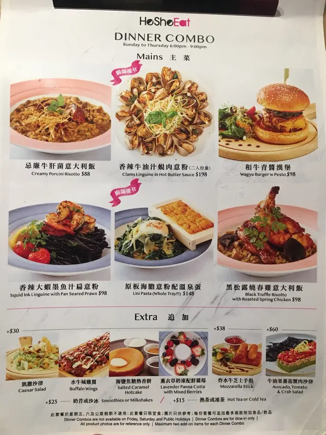 以前食he she eat一定要出九龍或過銅鑼灣。早排見到荃灣綠楊坊開左間he she eat, Dinner combo非常吸引,即刻叫肥仔放工同我去食。唔知係咪新開業promote, like & share Facebook page仲有免費黑松露薯條,當然唔蝕底啦!薯條熱辣辣,沾上黑松露醬完全食到停唔到口。另外加多個水牛城雞翼作小食。每隻雞翼都舖滿hot sauce, 小小辣幾惹味。晚餐餐牌上最吸睛一定係原板海膽意粉配溫泉蛋.意粉上布滿芝士和小量菠菜,一邊拌勻芝士,溫泉蛋和意粉時香味四溢,入口質感creamy, 每條意粉都沾滿芝士和忌廉。把海膽放在意粉上再入口,感覺又完全不同了。冷熱同時入口,海膽味沒有被芝士蓋過,反而鮮味有點減膩。黑松露燒春雞意大利飯燒春雞皮脆肉嫩,肉好多,食左一半已有點飽的感覺。意大利飯加入黑松露和大量雜菌,味道濃郁,好味。到he she eat當然不可錯過甜品!綠茶控的我每次必點綠茶心太軟。綠茶心太軟熱辣辣送到。一切開綠茶漿隨即流出,蛋糕配上綠茶漿味道濃郁又不會過苦。再加綠茶雪糕,超正。唔洗5分鐘我已經消滅了。肥仔點了佢最喜歡的厚焗鬆餅配夏日鮮果及乳酪雪糕。厚焗鬆餅表面小小脆,入面鬆軟,加上糖漿及鮮果入口,味道清新。一邊咀嚼時更有淡淡蛋味,不錯!…Read More