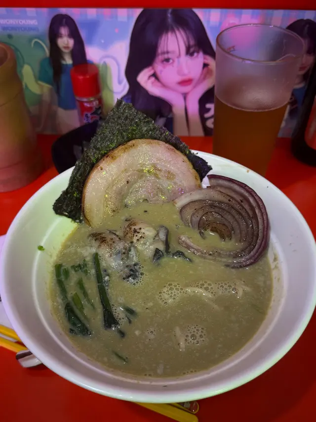 出到黎尖沙咀,原本心血來潮食拉麵,碰吓運氣去幕多望下洗唔洗排隊,一望!條隊龍已經排緊十幾廿個人…見到對面有間拉麵店幾特別又有座位,就入左去試下。裏面座位唔多,只有九個,由落單到烹調料理再埋單清潔枱面都係老闆一腳踢!店內環境擺設都係以繪麗奈為主的,相信店主都係一個繪麗奈嘅忠實粉絲。叫咗一個蠔湯拉麵$128同鯛魚湯拉麵,本人第一次食蠔湯拉麵覺得非常好食