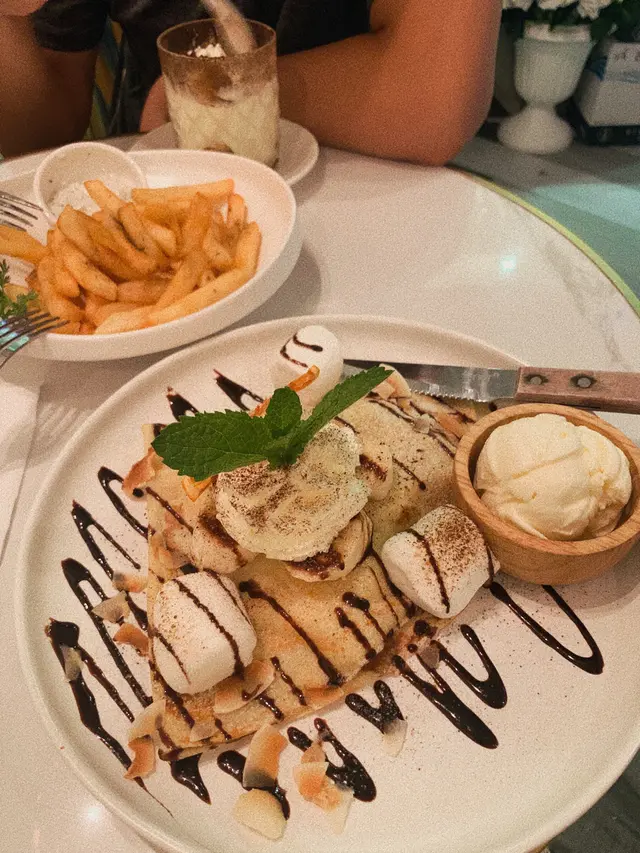 平時lunch或者晚餐都會見到唔少人排隊,同男朋友預早食左個tea,餐廳環境好fancy,係田園歐陸風,幾打卡able😂 然後發現同場通常都係女仔friend或者係情侶,連男朋友都問我洗唔洗影下相😂😂 的確係約會/同friend gathering既好選擇👫🏼👭🏼🍟黑松露醬薯條 大愛薯條既我去到邊都會叫😂 薯條外脆內軟,配埋黑松露醬無咁單調,做前菜的確幾好😬😬🥞香蕉榛子朱古力忌廉班戟加雲呢拿雪糕又係冷熱交融既甜品🤤 班戟皮做得幾好,好薄,配埋cream+生果🍌🍫+雪糕好match,一個人都可以食哂!!🍨Tiramisu 男朋友話好似食緊雪糕,質地好幼滑但唔會過甜😋因為唔係太肚餓嘅關係我哋都冇試到其他主菜,唯有留返下次機會啦😆…Read More