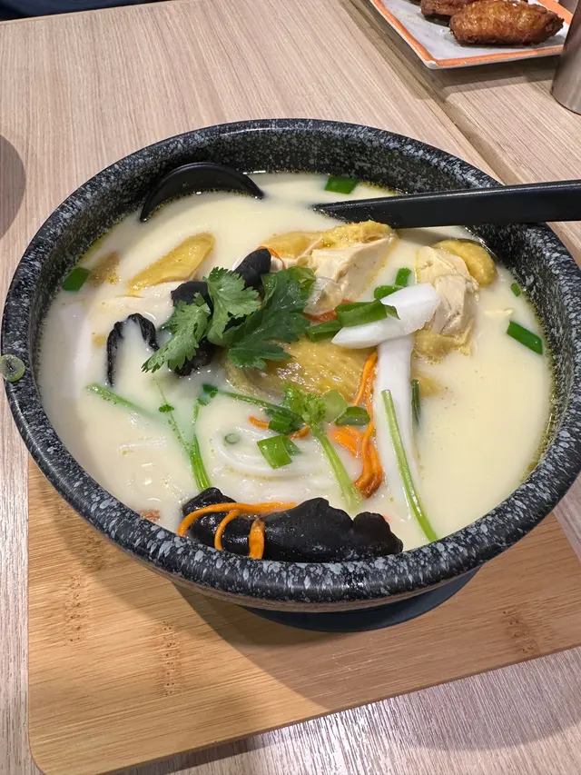 今日好大雨唔想周圍行搵野食, 喺駱駝漆行街就順便食埋Late Lunch,行到最後一層見到一間好新淨,食雞嘅舖頭就行左入去。舖面好乾淨企理,D 坐位又唔會好迫。我同朋友叫左一人一碗米線同野飲,仲有一份雞翼。🌸 椰子雞米線成碗雞湯奶白色,唔油膩,入口好順滑,仲有微微椰子香味。米線入味,軟硬適中,份量仲好多。店主好有心思,碗米線仲加左不同配料,金銀花、雲耳、椰子片,當然仲有主角「雞」啦。雞件份量唔少, 就算有雞胸肉質都好淋身,而且D 皮好簿唔肥, 食埋都唔會有罪惡感。最後梗係成碗米線連湯清曬❤️🌸 姬松茸竹笙花膠雞米線 本身諗住都係雞湯,D 湯底大同小異,但原來兩個分別好大。姬松茸好香,似菇菌嘅味道,湯底濃郁,但唔會過鹹,味道調較得剛剛好。呢碗有竹笙、花膠,竹茸爽口而家有厚度,個質感係令人滿足嘅,而花膠都好優質,好淋同漿口,膠質非常重🥰🌸 悍匪雞翼(胡椒孜然)我地仲叫左個小食,雞翼上到枱熱辣辣,而上面灑左少少胡椒,好惹味,雞皮脆口, 肉質嫩滑有汁,好食👍👍…Read More