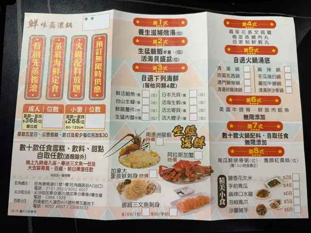 一個價錢食到咁多款野好抵食!先用蒸氣鍋蒸海鮮🦐🦞,然後下面會放粥,海鮮精華會喺蒸時落哂去粥底,之後仲有打邊爐🫕一嚟先有一人一碗燉湯,係非常足料嘅蘿蔔豬骨湯🤩,啲肉燉到非常稔,湯頭鮮甜濃郁,有淡淡藥材味。然後會上三文魚刺身,厚切三文魚,食落好鮮甜😋。每個套餐仲包蜆同半隻龍蝦,有專人服侍,幫係逐款海鮮蒸,蜆非常清甜,龍蝦好彈牙🦞。每枱可以8選4款海鮮嚟做蒸海鮮,今次揀左鮑魚,生蝦,蟶子同元貝,每款都好新鮮😍蟶子同元貝有蒜蓉一齊蒸,食落非常惹味蒸完海鮮最後會蒸埋雞同紅棗糕。碟雞下面舖咗陳村粉,食落有啖啖雞油香🤤紅棗糕甜度剛剛好,唔會太甜。除咗蒸鍋外,另外仲有一個鍋係用嚟打邊爐,叫咗清湯加麻辣湯,清湯有淡淡豬骨湯香味,麻辣係川式麻辣味🌶,配埋出面自助吧嘅花椒油非常惹味。牛肉任叫,其他火鍋配料可以出去自己攞🥬🥟,都切得好靚,食落牛味夠濃,又唔會韌。經過一輪蒸海鮮蒸雞後,底部嘅南瓜排骨粥吸收曬啲精華,食落非常香海鮮味,味道香濃,粥嘅濃稠度都啱啱好。…Read More