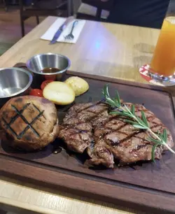 今日,同朋友去完銅鑼灣買嘢,佢介紹呢間“The Musicbox Grill House & Bar” 餐廳畀我,,話啲扒好正。餐廳環境雅緻,燈光柔和,播放住輕快嘅音樂,營造出舒適的用餐氛圍,服務員熱情周到。我哋order草飼澳洲肉眼牛扒10oz,medium well。牛扒的外觀色澤誘人,當我切開第一口,肉汁四溢,入口口感滑嫩,恰到好處的熟度讓每一口都充滿了肉的鮮美。醬汁同海鹽,與牛肉的濃郁味道相得益彰,增添層次感,令人一口接一口,非常享受。配菜有烤菇, 薯仔同車厘茄。烤菇肉厚多汁,原隻薯仔軟滑,新鮮嘅車厘茄保鮮甜,同牛扒形成了完美的搭配。整體而言,非常滿意。無論是肉質的鮮嫩度,搭配的醬汁、配菜,都展現廚師的用心。…Read More
