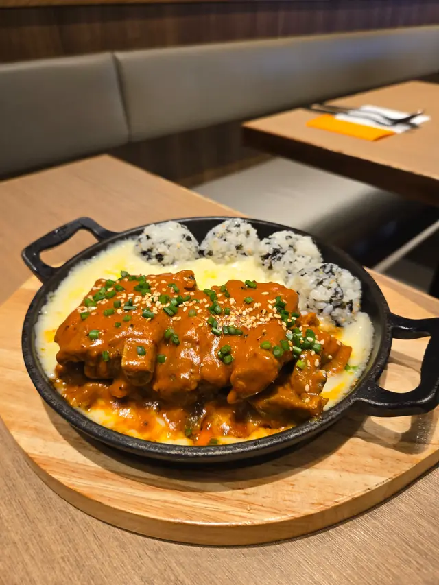 呢間韓式cafe環境真係幾舒服,地方寬敞,裝修簡約又有主題色橙色,感覺好有活力,打卡一流。今次叫咗半半炸雞,分別係蜂蜜味同粟米味。蜂蜜味炸雞外皮香脆,甜甜地又唔會膩,雞肉嫩滑,真係一食停唔到口。粟米味就好特別,帶住淡淡粟米香,配埋炸雞一齊食,幾有驚喜。芝士辣味排骨鍋排骨鍋一上枱已經聞到香辣味,排骨夠入味,辣度啱啱好,唔會太嗆。芝士溶晒包住排骨,拉絲效果一流,芝士控一定要試。飯團搓成波波,加埋芝士一齊食,鹹香又有層次,食完好滿足。玫瑰醬八爪魚豬五花意粉 意粉掛滿韓式醬汁,味道特別,八爪魚同豬五花肉都幾彈牙,唔會太油膩,幾有新意。甜品賣相好吸引,窩夫外脆內軟,帶住淡淡牛油香,配上新鮮蜜瓜粒,清甜多汁。甜而不膩,真係有初戀嘅感覺!呢間cafe無論環境定食物都好有水準,服務又有禮,下次一定會再嚟試下其他菜式。…Read More