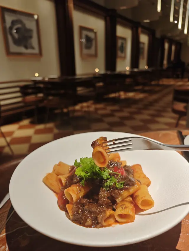 之前見過朋友係度食飯打卡,今日終於有機會黎試下。餐廳超高樓底加上圓拱型頂部,真係有啲似置身教堂咁,高雅又有情調,坐得舒服,環境真係滿分。今次叫咗幾款招牌菜:✨️燴牛腩粗大管粉  牛腩炆得好腍,入口即化,啲汁好入味,配粗大管粉一齊食,掛汁一流,每啖都好滿足。✨️風乾火腿蘑菇薄餅  呢個薄餅真係必推!餅底焗到外脆內煙韌,咬落去有層次感。配料雖然簡單,但用料好新鮮,火腿鹹香,蘑菇多汁,芝士唔會太膩,啱啱好,食完想再encore。✨️招牌牛肉漢堡  漢堡包鬆軟,牛肉扒厚身多汁,咬落去有肉香,配埋新鮮蔬菜同醬汁,味道好夾。份量都幾足,食完好有飽足感。薯條熱辣辣,外脆內軟,唔會太油膩。餐廳環境真係冇得輸,打卡一流。食物質素對得住個價錢,服務都幾好!…Read More