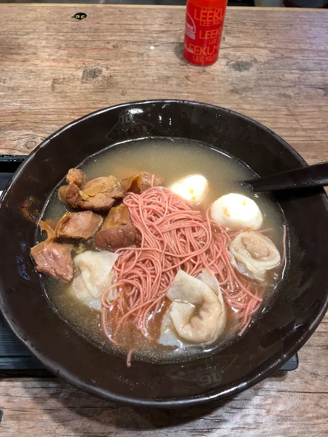店舖玩懷舊feel,有種70 80年代,屋村車仔麵既感覺,但環境光猛企理,又無咩油煙感,坐得都舒服。車仔麵最少要叫3個餸,腩汁底,揀左蝴腩,芝心丸同魚皮餃。而麵揀左紅菜頭麵,平時好少見,好似好特別,就試下啦!🍅呢日落住雨,所以lunch time 唔算太多人,好快就上到菜。第一啖試左個湯,老實講,馬馬地。腩汁既味好啖,似係用左清湯溝稀左,愈飲愈覺得係平時上湯既味。而紅菜頭麵係搶眼既,粉紅粉紅色,好靚好特別,不過食落無咩特別,相比下都係蝦子麵香d!🍜而餸菜方面,蝴蝶腩係3樣之中最出色,味道最好,蝴蝶腩🦋每件切到一小件咁,可以一啖過食,而每個肉都會痴住少少根膜,所以煮完有少少捲曲,望落就似蝴蝶,不過個根膜一d都唔韌,好味既!而芝心丸真係流心既!魚皮餃就不過不失ok啦!食物上,整體腩係ok既,其實就一般la。而呢度既環境比食物更特別。…Read More