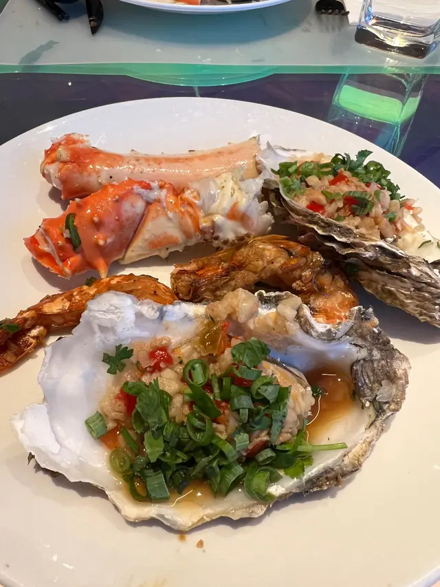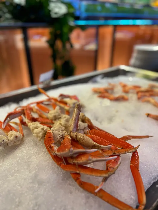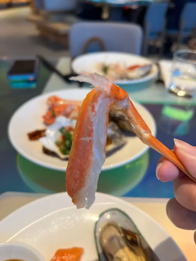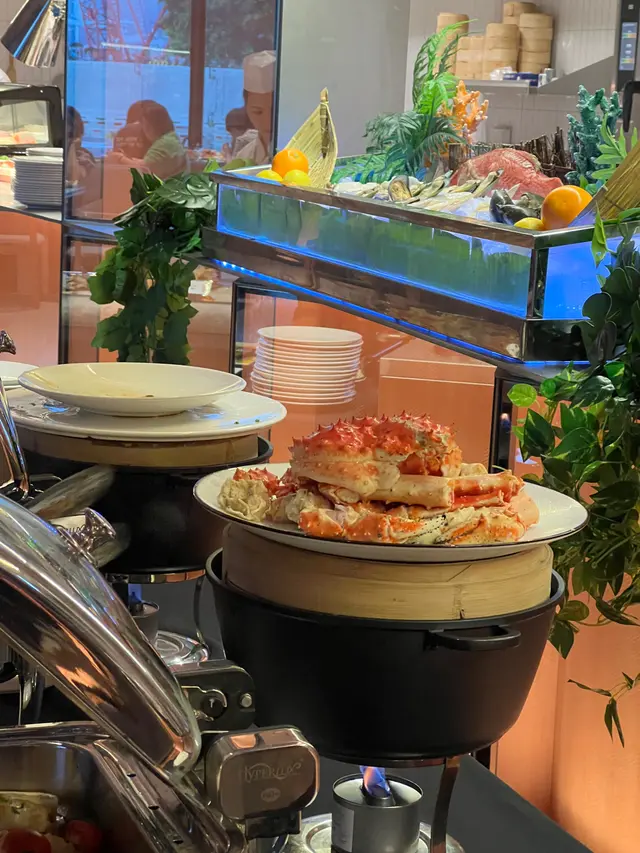我哋6:30pm入座,首先當然要去食海鮮!有蠔、扇貝、青口、蟹腳等等!蟹腳啖啖都係肉!蟹肉味都好鮮甜~其他食物方面,都有好多唔同嘅款式,例如有中式熟食、芝士麵包bar、pizza、燒味,我自己好like個芝士bar,有好多唔同款嘅芝士,仲有魚皮!魚皮十分爽脆,同埋好耐冇食過喇,估唔到自助餐裏面竟然會有!仲有唔同嘅counter /小食車,有我最鍾意食嘅片皮鴨,片皮鴨係佢會包好一份份,即切即整,鴨皮十分脆👍🏻同埋仲有即切牛扒,牛扒大概五成熟,啱我口味,牛味亦都十分重,旁邊仲有得自己夾薯條,薯條又熱又脆
