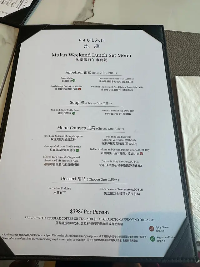 點了兩個假日午餐,結果讓我非常失望。首先,食物的味道實在是太普通了,完全沒有預期中的驚喜。餐點看起來雖然擺盤精美,但入口後卻只是平淡無奇,沒有任何特別的風味,讓人覺得很失望。糖醋燴豬後腿味道和普通茶樓豬腳薑一樣,鹹蛋黃鳳尾蝦扁意粉味道非常一般,蝦則冰鮮蝦質素。考慮到假日午餐的價格,我期待的是更高的品質和味道,但這次的經歷讓我覺得性價比極低。我可能不會再回訪,因為這樣的表現實在難以令人滿意。冇下次。