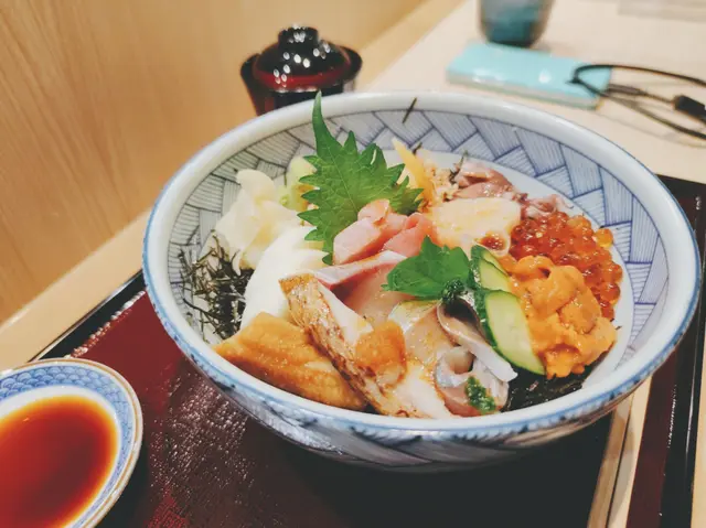 十款超新鮮食材的丼飯,當中包括油甘魚、拖羅、鯖魚、左口魚裙邊、帶子、甜蝦、魚子、海膽、吞拿魚蓉及竹筴魚。調味飯中加入了芝麻、紫菜與及葫蘆瓜,吃下去有一股醃燻的味道連帶芝麻的香,十分特別,亦帶有淡淡的姜味。※注意:食材會跟據季節有所轉換1&2) 肥美的油甘魚與拖羅3) 嫩口的鯖魚4) 爽口鮮甜的左口魚裙邊 (超推薦!!)
