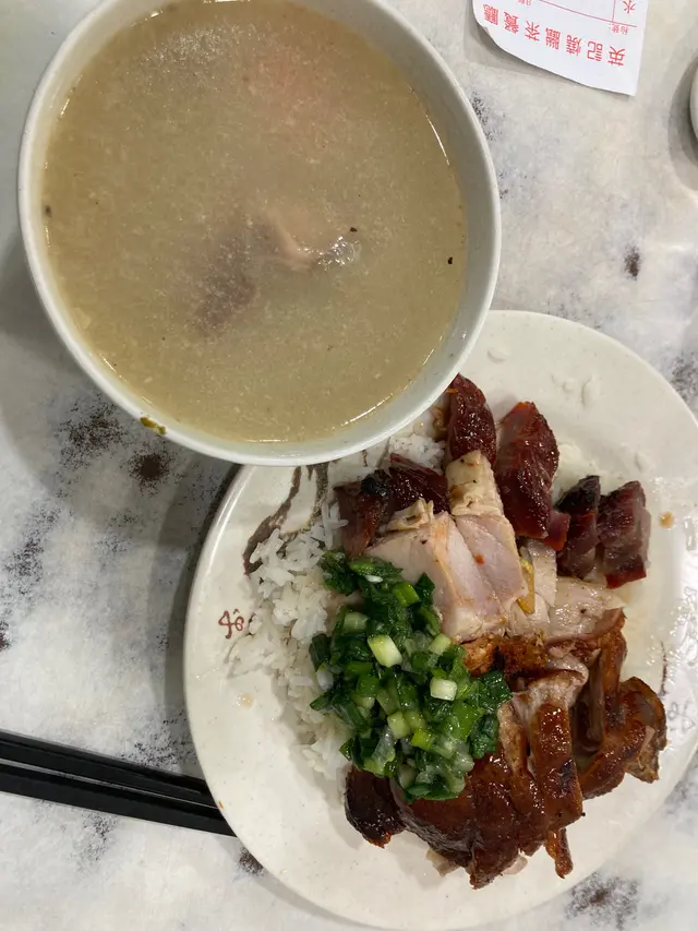英記,舊式燒臘茶記,好多年歷史,附近啲餐廳轉左幾手佢都仍健在主打燒味同小菜,燒臘都算出名,特別係豬,乳豬、燒肉、叉燒都正,今日食晏,午餐第一號永遠係是日推介既三拼燒味,無錯係三拼性價比高,叉燒燒肉燒鴨飯加葱油,飲例湯叉燒💖💖💖💖💖💖💖燒肉💖💖💖💖💖💖💖燒鴨💖💖💖💖💖菜乾豬骨湯 💖💖💖💖💖💖💖大大碟快靚正上枱,飲下個湯先,堅係正濃老火湯,燒臘飯店既好處就係拎啲頭頭尾尾去煲湯,通常都好足料好好味叉燒又香又正,肉質腍有焦香味,好食燒肉仲正,皮脆肉夠晒嫩,好好味燒鴨都唔錯既,夠滑,配葱油食埋碟飯,性價比超高既燒味飯午餐!…Read More