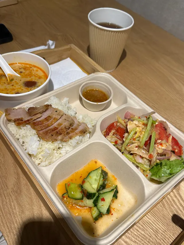 今日收工同朋友約左係長沙灣廣場等,行上3樓原來有幾間食肆,沿路見到呢間金水堂坐左好多人加上好耐冇食泰國野就選擇左佢見佢有海南雞、豬頸肉、香葉肉碎飯等等嘅泰式野,我又咩都想食啲所以就膽粗粗問店員可唔可以加錢轉雙拼😆最後我嗌左個海南雞雙拼豬頸肉飯😋雞已經去左骨,好嫩滑!!豬頸肉略嫌燒得唔夠脆但yum埋啲汁真係好野味店員話個湯係用雞骨熬出嚟所以都十分之夠味,🐔味濃🤣我朋友就雙拼泰式手撕雞同豬頸肉仲額外加5蚊就有碗冬陰公湯我地另外都有嗌到泰式炒芥蘭由於我同朋友都唔食得辣所以叫店員幫我地走辣芥蘭好新鮮 又係好入味好送得落飯🍚總結:整體食物都不錯有意料之外嘅驚喜店員好服務態度性價比高絕對可以encore…Read More