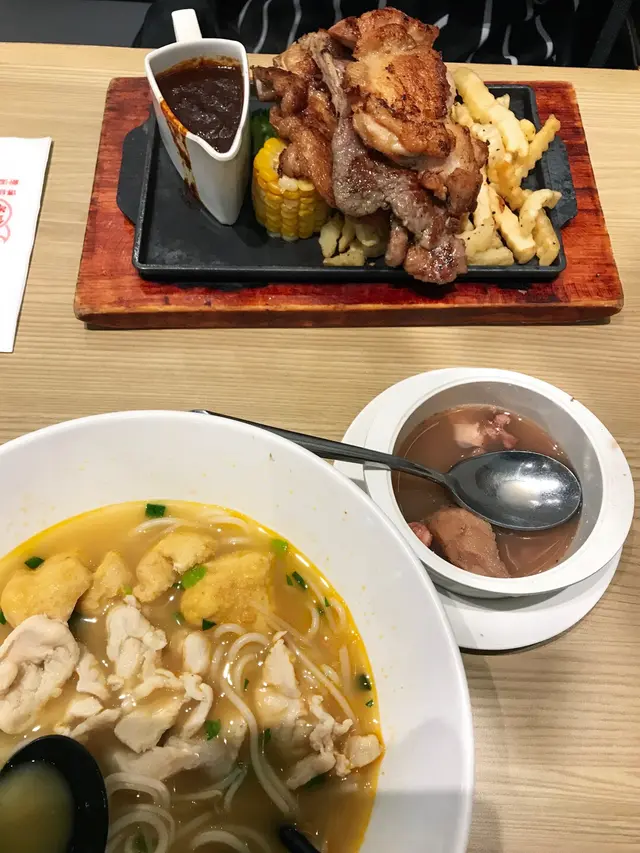與同事加班完非常肚餓 走到APM覓食去了間米線專門店打算吃麵 結果受了一肚氣便想轉場去其他餐廳 友人說試一試金記冰室我起初抱著冰室應該是外面街上地鋪的才好味的心態進入餐廳大約是晚上10點多 不用等位一進門口已有侍應招呼我們(值得加分)原本是帶我們去搭枱的 我們剛好看見有空的卡位便坐了卡位 2人坐得很舒服很寬敞一打開餐牌 友人說與翠華餐廳的菜式好像一樣我一直都想吃米線 所以點了麻辣雞肉片米線$40而友人則點了鐵板雜扒 這個晚市餐包了一個湯及一杯熱飲 盛惠$80餐牌上沒寫明麻辣米線有分辣度 幸好侍應有詢問叫了小辣都覺得有點辣😂本來以為$40一碗米線 份量應該很少 原來份量都頗多 吃完一碗已經飽了而鐵板餐的豬扒,牛扒和雞扒都處理得不錯坊間許多雜扒餐都是只有其中一塊扒比較好吃其餘兩塊是陪襯 但金記的鐵板餐值得一讚 連友人都說很久沒有吃過好味的雜扒餐🤤這樣的價錢我覺得抵食 當然不能說便宜而是這樣的價錢買到好的服務態度及好吃的晚餐已經是值了!上餐速度頗快 而且侍應都有禮貌 手腳俐落會令人想再次光顧的店鋪👍…Read More
