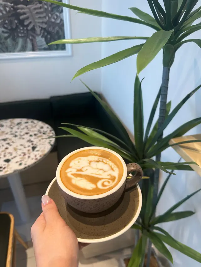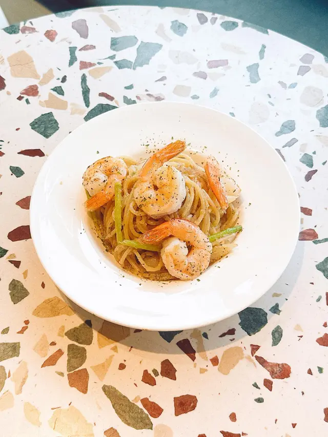為這個黑金蒜辣大蝦意粉回來很多次,這道意粉炒得偏乾身,香氣誘人,黑蒜的濃郁焦香與微辣醬汁結合得恰到好處,辣度溫和但足夠提味。大蝦新鮮彈牙,份量適中, 不用剝蝦殼吃起來很方便。麵條煮得Al dente,裹滿醬汁卻不會過膩,黑蒜的甘甜餘韻讓人回味。Flat White拉花非常漂亮,咖啡豆風味偏堅果調,與綿密的奶泡融合順滑,口感濃郁但不厚重。拉花細緻,溫度剛好,可惜奶泡稍嫌太輕,若再厚實一點會更完美。整體是一杯平衡感不錯的Flat White,適合搭配重口味的意粉解膩。…Read More