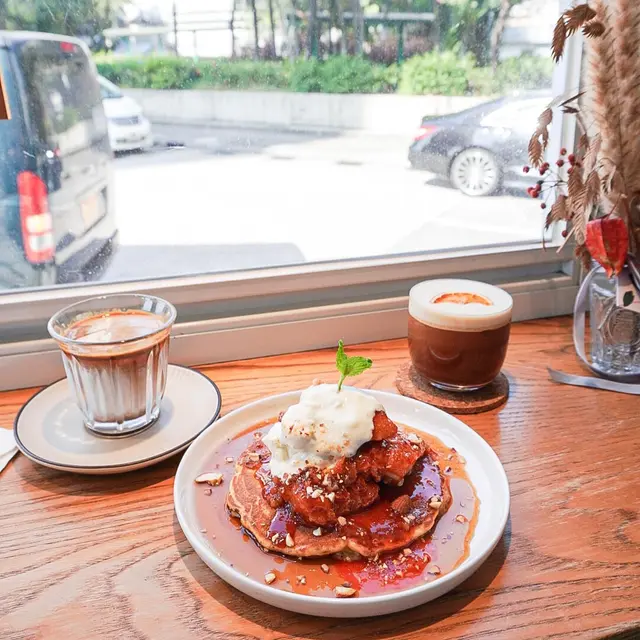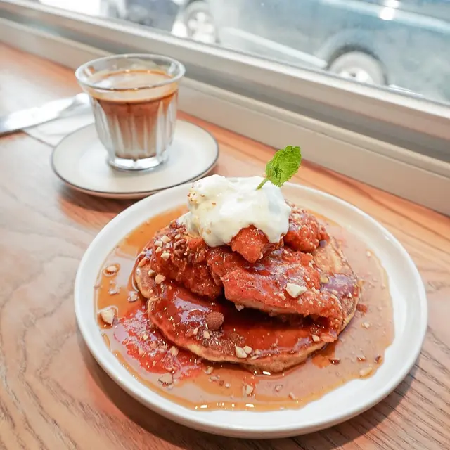 之前經過呢個綠色轉角位見到坐滿人,決定要再搵一個週末早少少到!小店座位唔多,我哋剛好坐咗喺靠窗邊的吧枱🌿☀️週末陽光照射入來有一種特別寫意好溫暖嘅感覺☺️這店最近推出咗全新pancake Menu,有鹹有甜一共有6款Pancake🥞我哋就揀咗鹹甜各一,分別係Oppa’s Chicken同Strawberry Bubblegum🍓🔸Oppa’s Chicken🍗呢個係韓式炸雞style既Pancake,有甜辣韓式炸雞,有3件炸雞,淋上的醬汁好足,食落都好濕潤好惹味!我哋特別鍾意佢面頭的酸忌廉醬,平衡咗炸雞嘅辣味😛🔸Strawberry Bubblegum🍓三層Pancake夾住麻糬!質感好軟糯🥰好好食!驚喜度滿分💯淋上好多士多啤梨果醬,酸酸甜甜好開胃🤤上面仲有一球雲呢拿雪糕😚旁邊又有脆片、士多啤梨、藍莓,整體配搭都好完美🙌🏻❤️小店有好幾款Signature Coffee都好吸引,我地都好想試,真係好掙扎!! 最後揀的兩杯都幾好,都啱口味。🔸Dirty Coconut🥥Dirty Coconut用上nutty啲既啡做base,加埋椰奶,質感順滑,椰味突出,又有層次感。🔸Yuzu Cold BrewYuzu Cold Brew 由韓國柚子蜜、鮮橙汁🍊自家製冷萃咖啡組合而成,面頭一層泡泡連同香橙乾片,飲落微酸,又帶有柚子蜜的甜味🍯完全可以平衡返食完Pancake甜甜鹹鹹的heavy感覺,成件事好refreshing🌿📍#TheThird (#元朗美食) @thethird.hk 元朗建德街69號大福大廈地下1-B號舖…Read More
