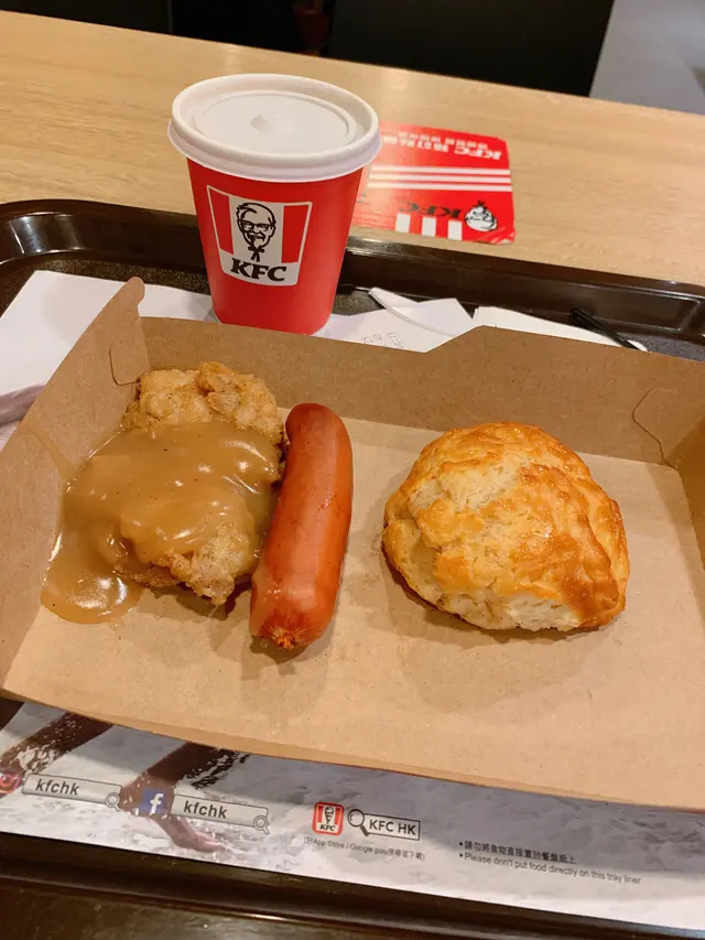 今天不用上班,先吃個早餐輕鬆一下,突然好想食鬆餅便去了商場的kfc ,現在有自助購買機真的方便好多,不用排隊可隨意選好想吃的東西。 不想吃的太飽所以選了雞扒鬆餅腸仔餐,餐廳闊落人不算很多,很容易找到位子。叫餐也很快,感覺很好。雞扒切下去是熱騰騰的,很香很脆,鬆餅也是熱的、加上外脆內軟,有甜的蜜糖在表面,感覺幸福滿足🤤。不過冷氣有點大,腸仔食到時已涼了一點,但終於吃了期待的鬆餅,過去中間有幾年好難食本來放棄了,但今日食到水準回復到當初,好高興,一定會再食🥰。…查看更多