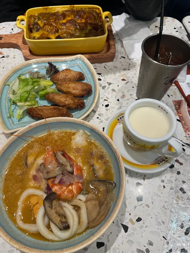 今日放工後去接朋友放工,佢係牛頭角返工,所以我哋就去咗九龍灣食晚餐!先去咗附近Donki買嘢,隨意喺附近揀咗個呢間 - 茶舍, 餐廳嘅服務態度幾好,當有客人入餐廳, 職員會講 “歡迎光臨茶舍”👍🏻以茶餐廳來講算係好好😎見到身邊幾枱都點脆炸軟殼蟹芥末醬吐司配薯條好吸引,但今日lunch 先食完公司三文治,同真係唔想食炸嘢了,想忍下口,加上天氣凍冰冰緊係叫返熱湯飯,暖下身濃蝦湯海鮮飯 - $72 配熱杏霜湯底熱辣辣, 西式嘅煮法,幾重白酒味,加埋紫洋蔥,湯底有蝦呢香味,有唔少嘅魷魚圈,一隻大蝦,帶子,青口,完全冇overcook , 所有海鮮都煮得啱啱好, 隻大蝦都幾好食咖喱牛腩焗飯 - $61 配凍檸茶 (+3)咖喱嚟講唔算好辣, 同咗好多舊牛腩同大量芝士鋪滿個飯,牛腩幾淋身,整個份量都幾多,一個女仔係食唔晒的🙈蒜香雞中翼(四隻) - $32幾香脆, 唔會炸到雞肉入邊好乾,雞中翼都算幾大隻👍🏻下次會想試吓牛扒同軟殼蟹吐司😎…Read More