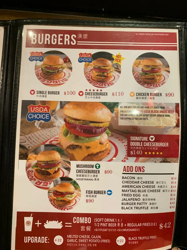因為疫情,之前一直都擔心不敢外出用餐。經過中環呢間連鎖漢堡包,被它全紅的裝修吸引,於是就入去一試。裏面環境光鮮,門口放置體溫計和消毒酒精,加上隔版分隔進食區,和食客數目限制,感覺安全。餐牌有各式各樣的漢堡包,有牛肉、芝士牛肉、雞肉、雜菌蘑菇和魚柳等,亦都另加錢再加各種配料例如煙肉,各種芝士,煎蛋等等...Cheese Burger 🍔 $110加$42, 飲品可樂和薯條套餐 .另外,我們也叫了經典水牛雞翼,好入味,辣辣哋好惹味!值得一試!😋😋Single Burger $100加$42, 飲品可樂和薯條套餐,另一飲品就選薑汁汽水 Gingle Ale. 薯條改為薯堡。Single Burger 也不錯,裏面亦有足夠的配料,酸青瓜很爽脆!薯堡,炸得粒粒飽滿,好香的薯仔味,好香脆!芝士漢堡的芝士好香濃,牛肉濃味多汁,邊沿仍有剛煎的脆,好回味😋加$22, 轉黑松露薯條,很多黑松露碎,黑松露味很強烈,薯條是即叫即整,熱熱的好香脆!原本我們想叫出名的奶昔,可惜無晒,唯有飲可樂和薑汁汽水。雖然今次飲唔到奶昔,薑汁汽水也不錯!整體來說,餐廳食得安心,很滿足的一餐!❣️…查看更多