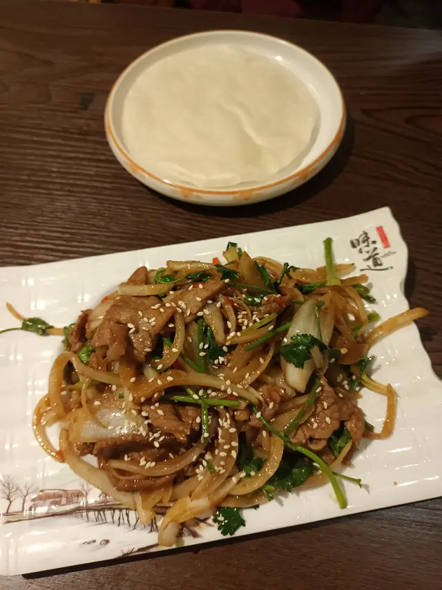 Stir-Fried Beef With Welsh OnionSeved with Sesame peel (6pcs)京蔥牛肉配6張麽麽皮