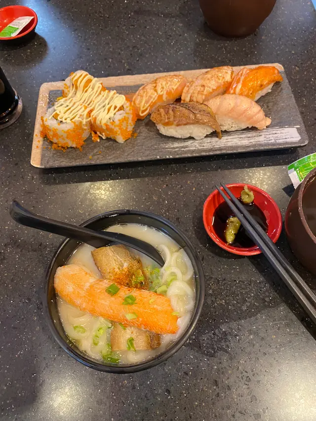 今天友人帶我來這家餐廳吃下午茶,疫情下裡面也坐了八成。我點了#26 八件左右壽司加迷你叉燒烏冬,仲有配餐飲。八件壽司中有三件炸蝦卷,其他食醬汁三文魚、火炙三文魚等。味道比想像中OK,以這個價錢$65算是很親民。另外叫了鐵板肥牛金菇卷,一份六件,配上洋蔥日式醬汁,非常入味。朋友還叫了炸雞軟骨,份量算多,但覺得雞軟骨偏小,可以炸得更鬆脆。想不到在現在還能找到價錢這麼親民而味道OK的餐廳。經過的朋友可以來試。…Read More