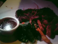 ?不好吃的西洋鍋:(。雖然這個是冬撰特選的料理,但味道實在不敢苟同了。叫了點小食,先說海老天婦羅。伴碟而上有綠色的綠茶盬和准盬。但粉漿太厚而蝦細小,所以第一口只嚐到粉的味道。終於吃到蝦了,是新鮮貨,但鮮味不足,是大陸蝦吧。蘸了綠茶鹽,恕我孤陋寡聞了,只吃到咸味,和普通鹽一樣,是我不懂欣賞了