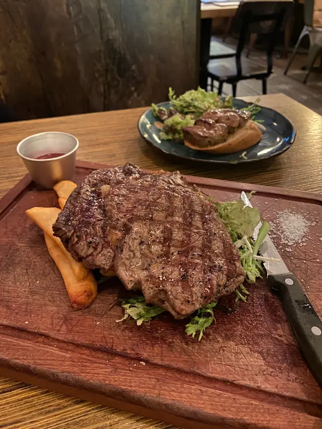 雖然外面係鬧市,但入到餐廳感覺唔同晒,好靜好舒服,而且性價比高、係勁抵食,雖然係工廈少少偏僻,但如果開喺其他地方又點會係呢啲價錢😜脆辣炸雞日式定食 $⁵⁸有四件炸雞、蒟蒻、芋絲、獅子、玉子燒、沙律,份量好多好抵食,炸雞外皮好夠脆、亦醃得好夠味。紐西蘭西冷 $¹²⁵5成熟,口感有少少韌、肉質比較紮實有嚼頭,牛味重,配上燒蒜牛油味道更香。配菜有沙律同薯條。另外每個餐+$8就有梳打水,試晒兩杯,覺得士多啤梨梳打甜甜地好飲啲,薄荷檸檬梳打就好重薄荷味。法式班戟海鹽焦糖、香蕉班戟 $⁴⁸榛子朱古力、香蕉、士多啤梨班戟 $⁵⁸法式班戟比起一般食既厚班戟煙韌,似平時食芒果班戟果種皮,我更鍾意哩種煙韌口感。兩隻味我比較鍾意海鹽焦糖味,好特別,唔甜而且咸咸地,但配埋香蕉甜味又啱啱好!另外+$15就有雪糕,但食唔晒無叫到🙈要注意平日3點後先有班戟,星期六就全日供應。…查看更多