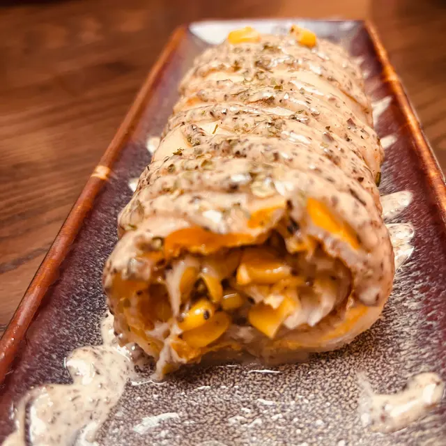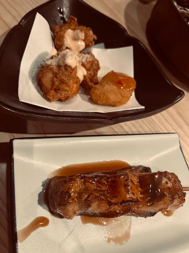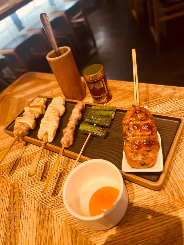 自家製的免治雞肉棒、長春雞腿串、雞腿肉、秋葵串和雞胸串。配上七味粉食用,更是惹味,肉質鮮嫩,讓人一口接一口,令人無法抗拒。我們還點了柚子梳打、水果茶和梅酒。