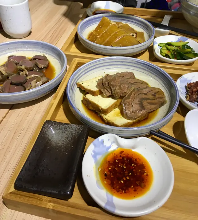 舖頭瀰漫文青氛圍,完全唔似係賣滷味食物。套餐以托盤上枱夠企理,應該花過心思選用碗碟,色調跟食品顏色相配,悅目喔,整體感覺似去咗台北日式小食店。滷水汁香而不過鹹,鵝有鵝肉的獨特香味,肉實夠入味。擔心老友記食唔到鵝,叫埋牛展併豆腐做後備,結果佢兩様通殺。鵝件大細適中,有啲係全肉,有啲帶骨,啱晒佢唔使吓吓啖啖肉。白飯份量足,略嫌冇飯香同較軟身;手工湯麵軟硬度適中,清湯入口唔口渴。老友記加麻辣醬再倒入點鵝食的醋汁,自製酸辣味。三小碟中點食魚仔同青瓜,前者得兩票,青瓜輸在冇咗爽脆口感。單點滷鵝腎同話梅花雕雞軟骨。厚身鵝腎帶紅心賣相靚,入味唔韌,送酒一流。花雕汁鹹咗啲,亦食唔到話海香,老友記食咗幾粒雞軟骨就放棄,激死禾。…Read More