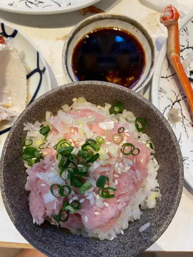 有同事話想試Fumi 好耐,應該係之前上網睇到人哋介紹。適逢呢個星期比較得閒,我哋成班同事星期六日去到Fumi 試下佢個A4宮崎和牛&松葉蟹腳放題($588)。價錢方面,算係比較大路,附近嘅餐廳週末semi brunch buffet 都係收緊咁上下價錢。但係魔鬼在細節,原來A4和牛只係每人包一份,要加$188先變成任食🥲呢個套餐係包一款主食,其他就全部都係任食,主食坦白講就真係唔係太吸引,我就叫咗個迷你香蔥吞拿魚腩井。質素有啲驚喜,但係份量始終比較少,同埋今日嘅主角都唔係佢。等我同大家分析下任食部份