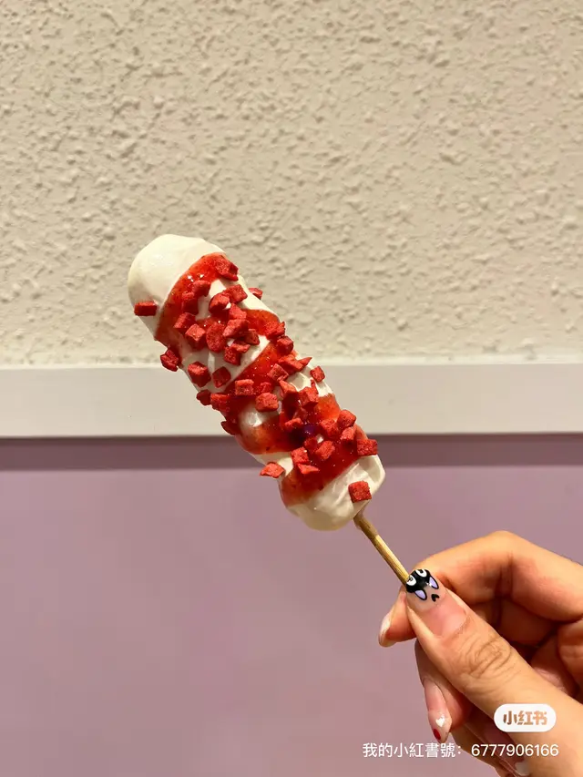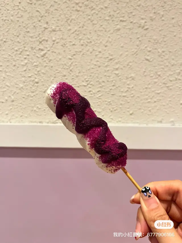 每顆麻糬上沾滿了芝士奶蓋,口感煙韌,搭配微甜紫薯粉,一條份量剛好足夠一個人吃完而不膩味道小評分:😋😋😋😋😋/5#草莓麻糬串串 $27