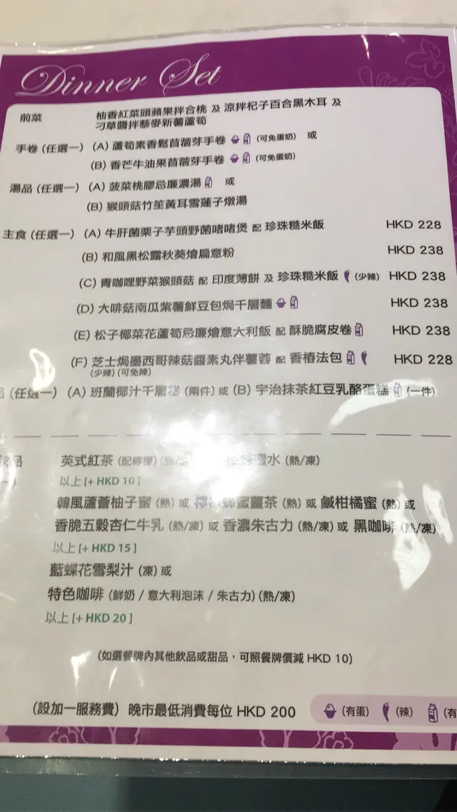 又黎三個姊妹去銅鑼灣搵野食,兩個姊妹表示唔想食熱氣野,想清清地。我就提議不如去食素菜。佢兩個都極少食素,自然要搵一間有水準既素菜館俾佢兩個試下。本身約左6:30,6點鐘我地到左佢都照俾我地入座,仲安排左卡位俾我地坐。裝潢都好清新,粉藍同白色好舒服三個都叫左Dinner Set B,E,F三個前菜都好開胃,特別係柚香紅菜頭蘋果拌合桃,手卷d菖蓿芽好得意呀食落,素菜都咁有驚喜。猴頭菇湯好足料好好味,好多桃膠😍😍朋友個菠菜桃膠忌廉湯都好香菠菜味,但又唔會好漏。黑松露秋葵燴扁意粉味道唔錯,若然個黑松露味再濃d就更好松子椰菜花蘆筍忌廉燴意大利飯就不過不失,都好飽肚。最後芝士焗墨西哥辣菇醬素丸拌薯蓉配法包(叫左唔辣),食到呢個已經好飽好飽,所以食剩好多,個醬配法包係幾好食。食物份量黎講算普通,但三個人都食唔哂,可以建議叫兩個set再叫d招牌菜。因為晚市要每人最低消費$200最後最後就係甜品,班蘭椰汁千層糕同宇治抹茶紅豆乳酪蛋糕。兩個都好好食菜式特別,係價錢上有d貴,埋單3個人8xx…Read More