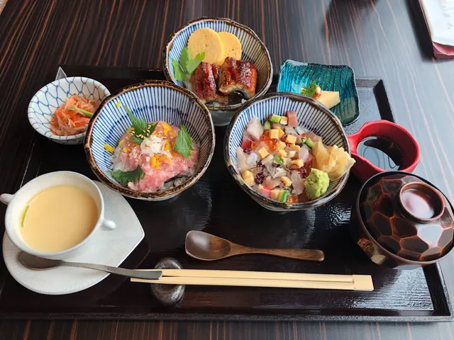 欣賞完咁靚嘅海景之後,我再細看餐牌,原來選擇好多,最尾我選擇咗一個三色丼。大概等咗5分鐘就上菜了。